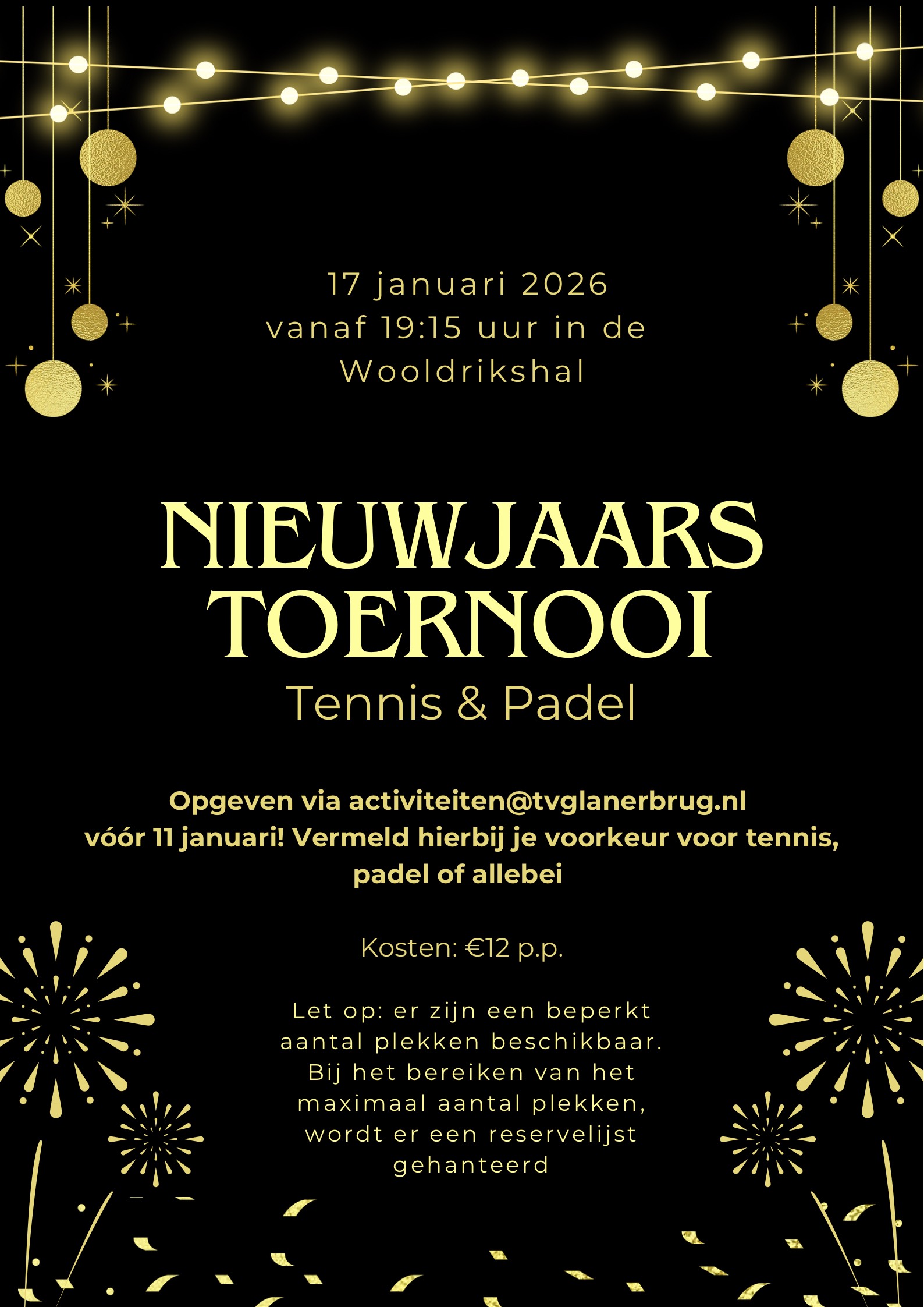 17 januari organiseren we het nieuwjaarstoernooi voor zowel de tennis als de padel leden van TVG. Het toernooi wordt dit jaar weer georganiseerd in de Wooldrikshal en dat betekent dat je je handschoenen en muts thuis kunt laten ;)