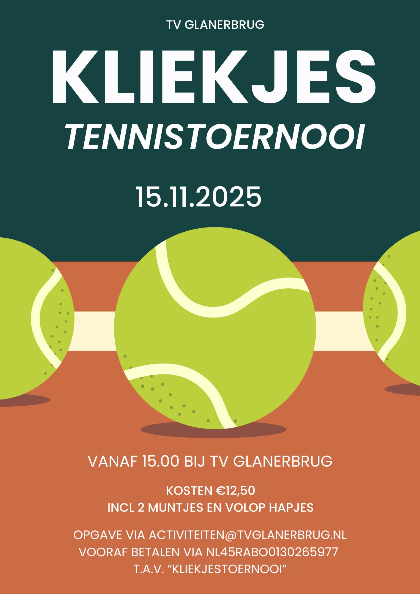 Ook dit jaar organiseren we weer het 'Kliekjes' tennistoernooi op zaterdag 15 november a.s.